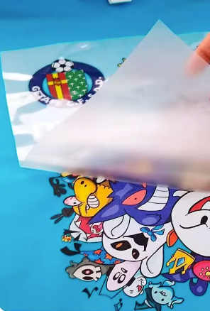 Your artwork is printed in vibrant CMYK + White ink directly onto a clear film, which is then coated with a heat-activated adhesive. Once printed, the transfer is applied to your final product using a heat press, offering a soft-touch finish, excellent durability, and bright, eye-catching color.
